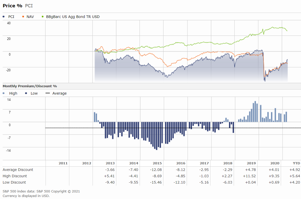PCI는 현재 NAV 대비 7.6 % 프리미엄으로 거래되고 있다. PCI의 프리미엄은 20 % 이상의 프리미엄으로 거래 되는 많은 PIMCO 펀드 (예 : PIMCO Corporate & Income Opportunity Fund ( PTY ))에 비해 매우 낮은 프리미엄이다 . 매우 유사한 자산을 보유한 PCI의 자매 펀드 PIMCO Dynamic Income Fund ( PDI )도 프리미엄 13 %로 거래되고 있으며 이전에는 20 %를 초과하는 프리미엄으로 거래되었다. PCI는 2021년에 훨씬 더 높은 프리미엄에 쉽게 도달할 것으로 기대한다.