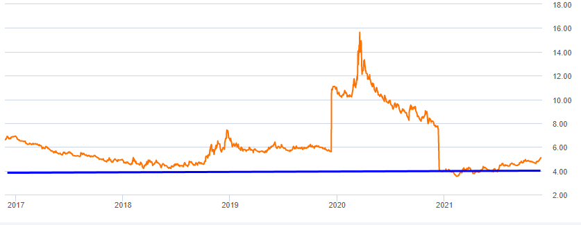 일반적으로 CEF가 디스카운트 또는 프리미엄으로 거래하는 이유는 펀드의 분배율(distribution rate, 주식의 배당율)과 관련이 있다. 즉, CEF는 배당주 관점으로 접근하는 인컴 투자자가 많다는 의미인 것 같다. 본 그래프(위/아래)의 CEF가 상반기 고점을 터치한 이후, 계속 빠지는 것 중의 하나도 분배율이 사상 최저 수준(파란선)까지 내려갔기 때문일 수도 있다.